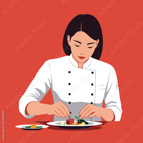 Chef plating dish, with precision, wearing a white uniform, against a solid red backdrop