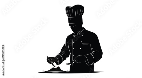 Vector illustration of a chef silhouette plating dessert on a plate.
