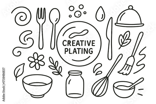 Creative Culinary Doodles. Hand-drawn doodle illustration Creative plating plate, fork, spoon, knife, cloche, swirl, droplet, foam bubble, flower, herb leaf,
