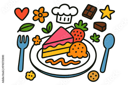Cartoon Dessert Delight. Dessert Plating. Colorful Hand-drawn doodle Children illustration cake slice, ice cream scoop, sauce drizzle, plate, fork, spoon,