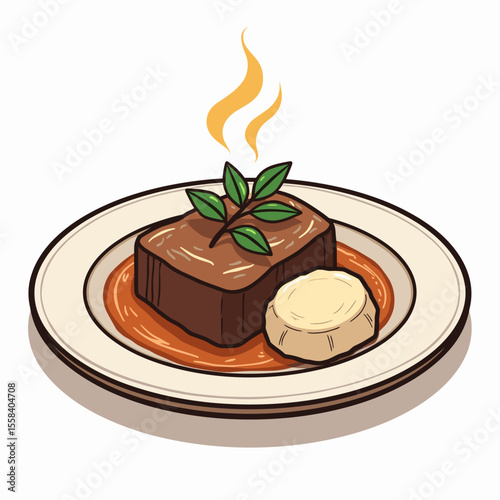 Delicious Braised Beef Dish with Creamy Polenta and Fresh Basil Illustration on a White Plate