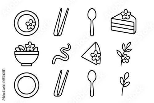Culinary Icon Set. Outline icon set of plating and garnishing with flowers: dessert plate, garnish tongs,