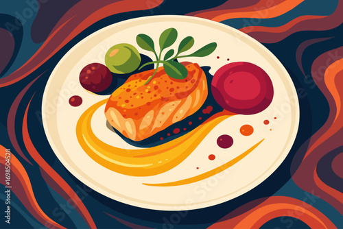 Gourmet Salmon Dish with Artistic Sauce Plating on Elegant Background