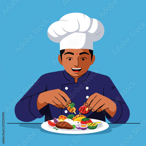 Chef plating colorful dish of grilled veggies, meat, and rice on a blue background