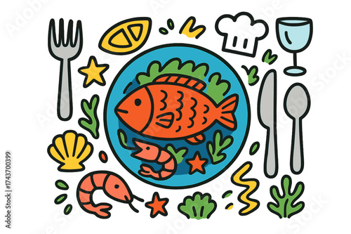 Colorful Seafood Doodle. Seafood Plating. Colorful Hand-drawn doodle Children illustration fish, shrimp, lemon slice, garnish, plate, fork, knife, spoon, sauce