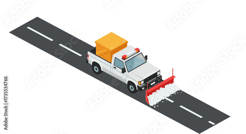 Red tractor with snow plow on road in isometric style for winter maintenance