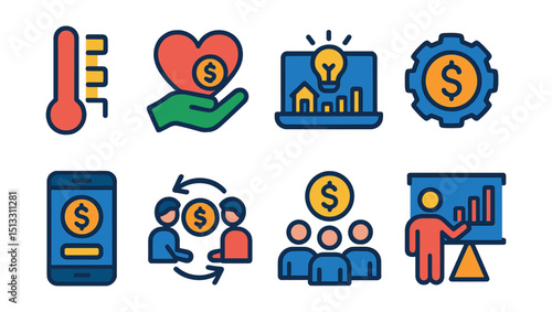 Flat vector icons of crowdfunding and fintech: fundraising bar, donation heart, crowdfunding platform, equity token, fintech app, peer-to-peer lending, investor pool, startup pitch.