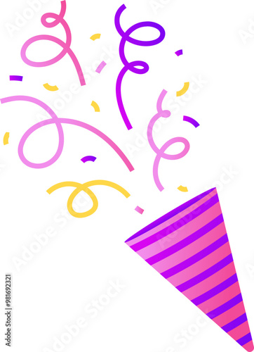 Cartoon illustration of confetti cannon, colorful party popper with stream of confetti