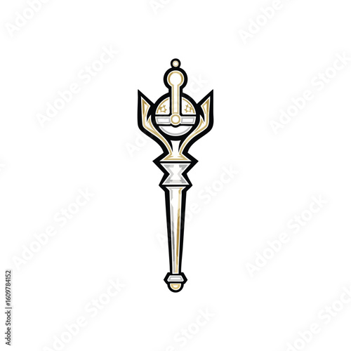 Regal Magic Staff Emblem. Captivating ceremonial rod with a luxurious golden and white aesthetic. This potent icon represents immense power, mystical forces, and royal lineage.
