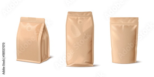 Foil bag. Vector plastic pack and paper pouch template. Blank food foil bag for snack isolated on transparent background. White package mock up for coffee and tea pack design.