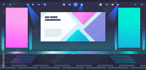 Conference hall, stage for presentation, empty dark scene interior with tribune, microphone, glowing spotlights illumination, huge screen and acoustic dynamics by sides, Cartoon vector illustration