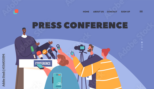 Press Conference Landing Page Template. Mass Media, Tv Broadcasting Event With Journalists Listening Black Man