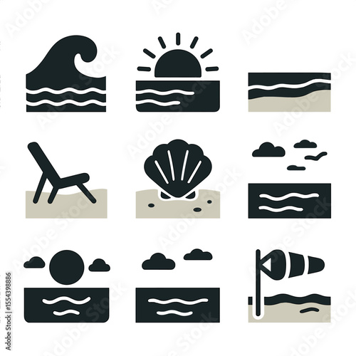 Serene Beach Icons. Solid, filled icons set of serene beach landscapes: turquoise wave, pristine sand, no