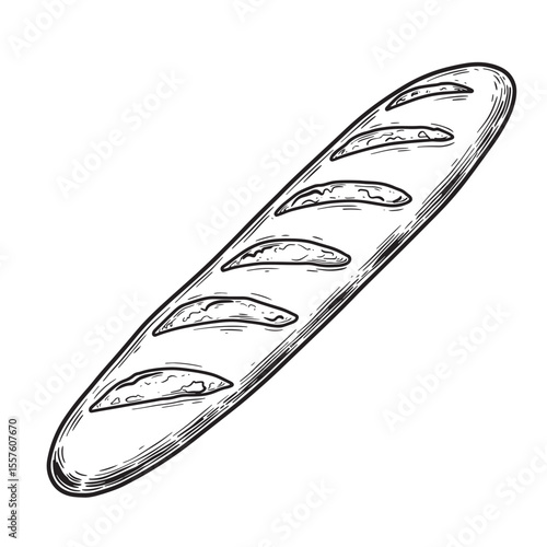 An elegant and detailed vintage art silhouette illustration of a freshly baked artisan french baguette isolated on a pristine white background.