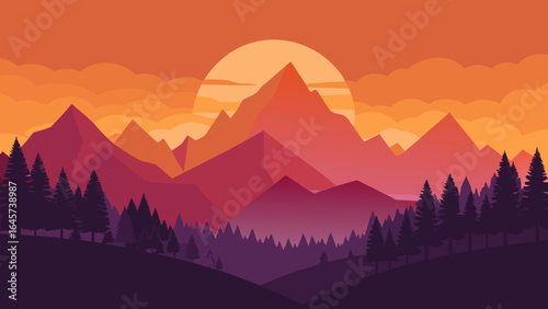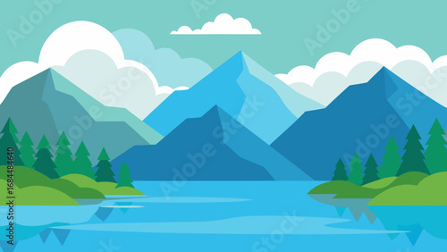 Pristine Mountain Landscape with Serene Lake and Pine Trees. Vector hand drawn illustration
