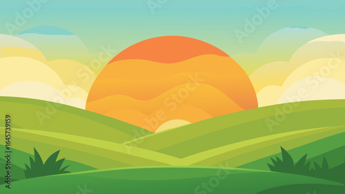 Cartoon Hilly Meadow featuring Vibrant Purple Flowers and Green Grass