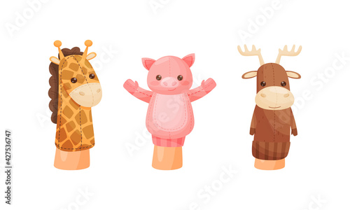 Figures of animals, heroes of the puppet theatre which put in the fingers of the hand. Vector illustration of characters to play with the children in role-playing games.
