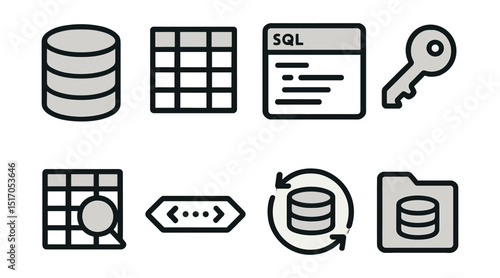 Outline with Fill icon set for database architecture: database stack, table icon, query panel, field key, search column, connection string, data sync, DB folder.