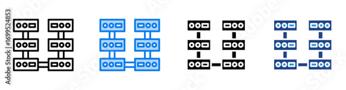 Database Icon Set. Databases linear icon set. stacked cylinders, server icon, cloud storage, data table, query window, connection arrows.