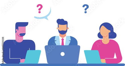Three people in a meeting with laptops and question marks, meeting, business, discussion, collaboration, teamwork, communication, questions, confusion, uncertainty, ideas, brainstorming, problem solvi