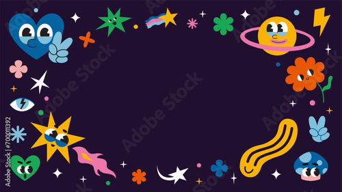 Set of stickers for planner and diaries, vector flat illustration. Comic groovy characters such as heart, emoji and stars in space, cartoon trendy image. 70s funny cute retro sticker pack