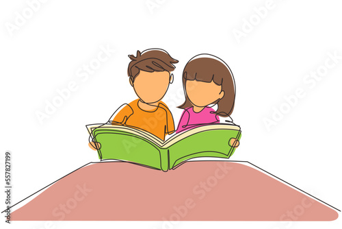 Continuous one line drawing kids reading books happily. Good reading interest. Really enjoy reading story books. Reading everywhere. Book festival concept. Single line draw design vector illustration