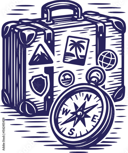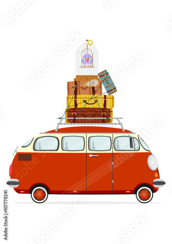 Vintage Car with Suitcase Monochrome Minimalist Vector Illustration