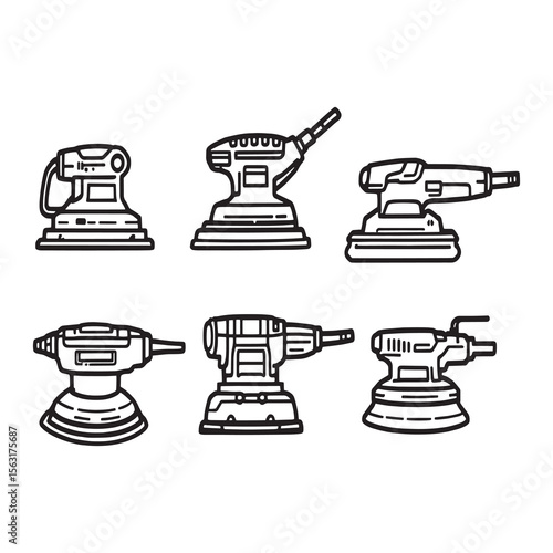 Electric sanding machine icons set. Collection of orbital sander icons representing various power tools used for smoothing surfaces in woodworking, metalworking, and automotive applications