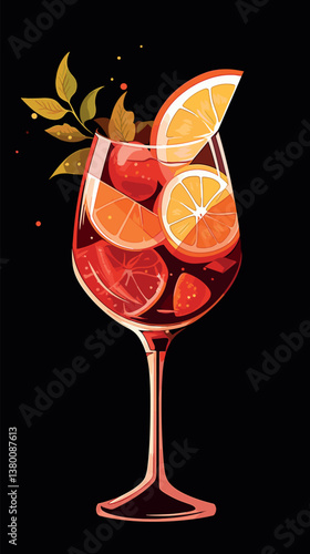 Refreshing sangria with citrus slices and berries in wine glass on black background flat vector illustration