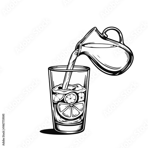 Refreshing pitcher of iced lemonade or sangria with fruit slices, sparkling line art icon vector
