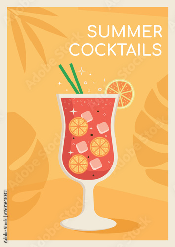 Glass of summer refreshing cocktail with ice and orange slices on the background with tropical leaves. Summer beverage. Poster with alcoholic drink. Vector illustration.