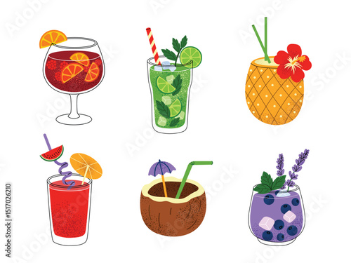 Collection summer drinks in glass, coconut and pineapple. Tropical cocktails with fruits, herbs, ice and umbrellas. Vector set for beach party, bar or summer design.