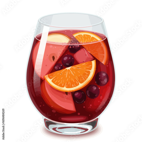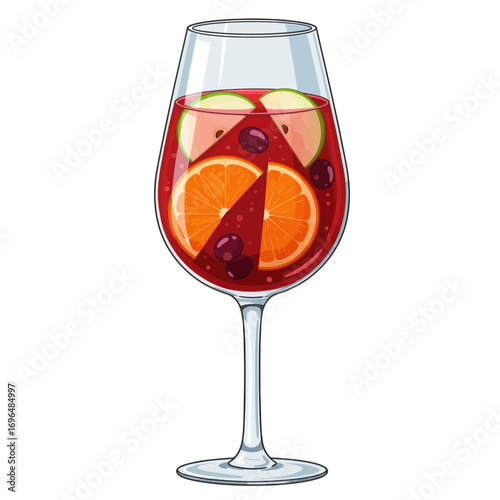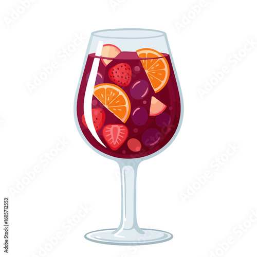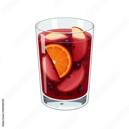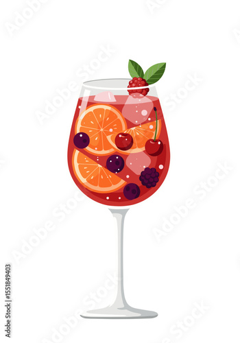 Tall glass of red sangria with orange, lemon, and berry slices, flat colorful vector illustration, isolated on white background