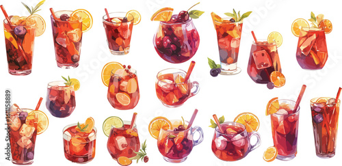 Refreshing sangria illustration with ice cubes and vibrant citrus slices, showcasing drink illustration. This delightful drink illustration contains fresh fruits and ice,