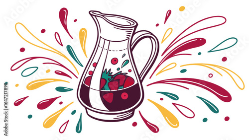 Sangria jug filled with fresh citrus fruits, apples and strawberries in an intricate ink drawing. Sangria jug containing refreshing beverage, perfect for summer days,