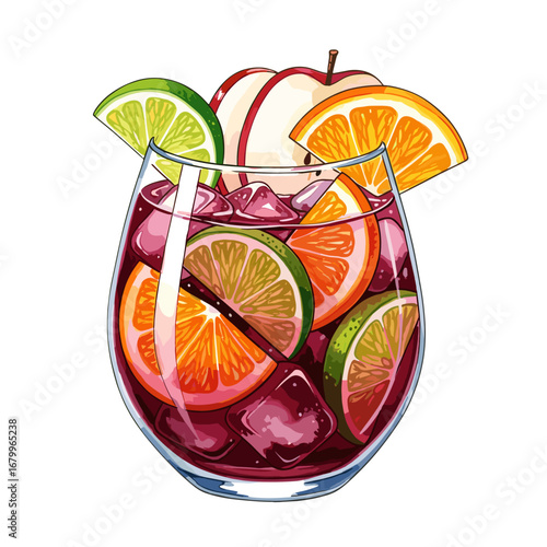 A glass of red wine sangria with ice cubes and fresh fruit slices. Vector illustration of a summer cocktail with orange, lime, and apple isolated on a white background.