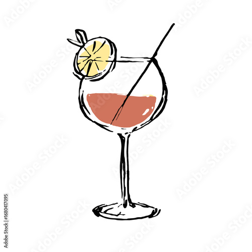Hand-drawn sketch illustration of a summer cocktail. Minimalist ink drawing of a refreshing alcoholic beverage like an Aperol Spritz or sangria with a citrus garnish.