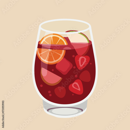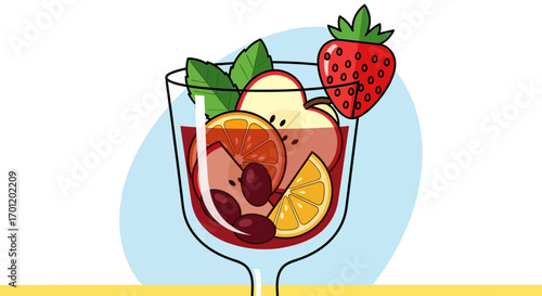 Glass of sangria with ice cubes, floating strawberries, lime, and orange slices, flat vector artwork with fresh and vibrant summer color palette