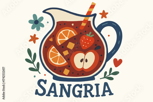 A pitcher of refreshing sangria infused with seasonal fruits and es adding a festive touch to the cozy tapas night at home.. Vector illustration