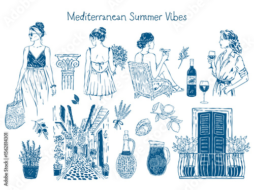 Vector set of hand-drawn women with wine and cocktails, combined with Mediterranean elements like lemons, balconies, flowers, and old streets. Perfect for prints, packaging, and summer-themed designs