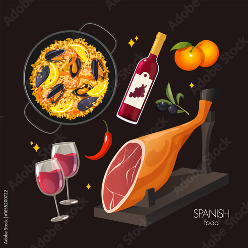 Vector collection with traditional Spanish food includes seafood paella in a pan, sangria wine in glasses and bottle, jamon on stand, red pepper, fresh citrus fruits and black olives