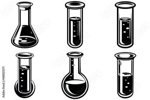 A collection of various laboratory glassware icons including beakers, flasks, and bottles in black and white outline vector style, suitable for educational and scientific projects