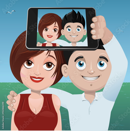 Family makes a selfie on a journey. Flat design vector illustration.