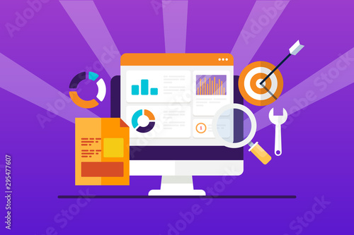Web traffic analytics, seo report, data analysis, business graph, social media metrics, financial information concept. Flat design vector illustration.