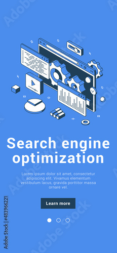 SEO development isometric vector illustration. Website or webpage development concept. Search engine optimization for business purposes.