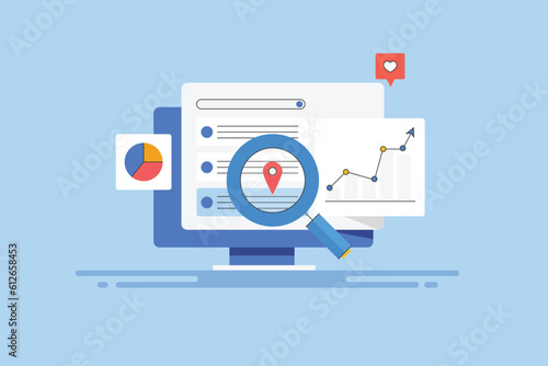 Search engine result page and web traffic analytics report on computer screen. Website seo data, graph and chart on dashboard interface, vector illustration.