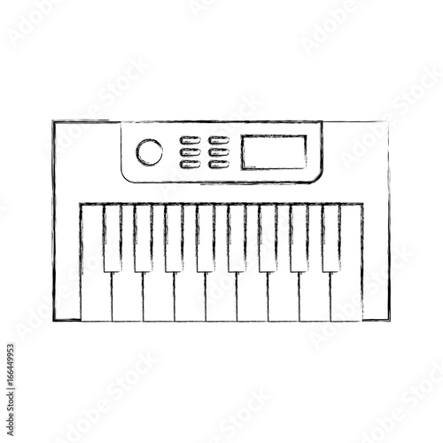 Drum machine or midi sampler. Producer equipment. Musical instrument. Hand drawn sketch in vintage doodle style.