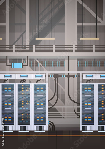 Modern data center server racks row technology computing equipment information storage digital network vector