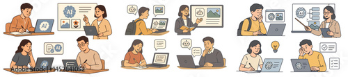 Two office workers with different moods and thoughts at their desks in a modern office setting