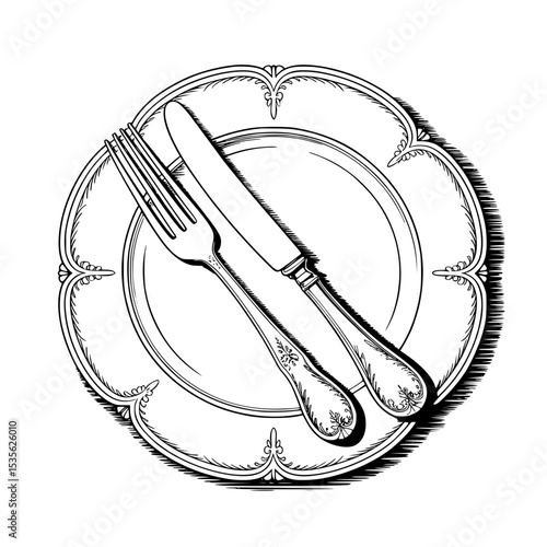 Table setting set. Fork, Knife, Spoon, plate sketch set. Cutlery hand drawing collection. Catering engraved vector illustration.  Dinner etiquette.
